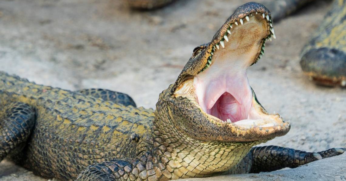 Ο άντρα βγάζει αλιγάτορα και σκυλάκι στη στεριά και με τα χέρια του ανοίγει το στόμα του μικρού θηρίου για να σώσει το κουταβάκι.