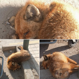 Η αλεπού βρέθηκε σε αυτήν την κατάσταση από μία κάτοικο της περιοχής που είχε βγάλει βόλτα το σκυλί της, νωρίς το πρωί της Παρασκευής. Το άτυχο ζώο έχει κομμένη ουρά και φέρει ένα τραύμα κάτω από το λαιμό.