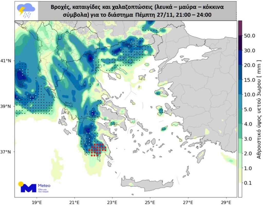 Στους προγνωστικούς χάρτες που ακολουθούν για τα διαστήματα (Πέμπτη 27/11, 00:00 – 03:00), (Πέμπτη 27/11, 09:00 – 12:00) και Πέμπτη (27/11, 21:00 – 24:00), αποτυπώνονται οι περιοχές όπου θα εκδηλωθούν βροχές ή καταιγίδες και οι περιοχές όπου εντοπίζεται η μεγαλύτερη πιθανότητα εκδήλωσης χαλαζοπτώσεων.