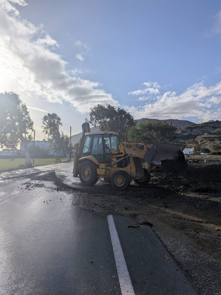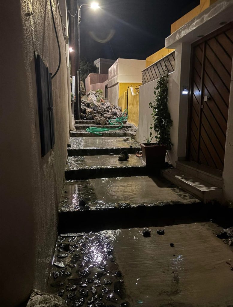 Στον Αθηνιό, τμήματα του βουνού υποχώρησαν από την ένταση της βροχής, προκαλώντας κατολισθήσεις και φράζοντας τον δρόμο προς το λιμάνι.