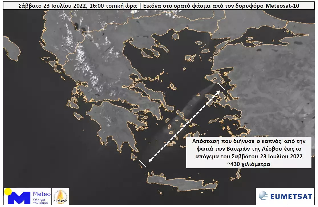 Σε οπτική δορυφορική εικόνα που ανέκτησε και επεξεργάστηκε η πυρομετεωρολογική ομάδα FLAME του Εθνικού Αστεροσκοπείου Αθηνών (ΕΑΑ) / meteo.gr από τον Ευρωπαϊκό δορυφόρο METEOSAT-10, φαίνεται ότι οι ΒΑ άνεμοι που πνέουν πάνω από το Αιγαίο μετέφεραν τον καπνό της φωτιάς έως και 430 km νοτιοδυτικά, πάνω από τα Κύθηρα.