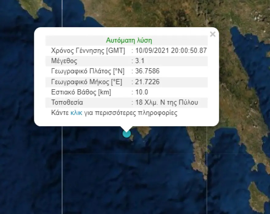 Η τοποθεσία της δόνησης ήταν 18 χλμ νότια της Πύλου.