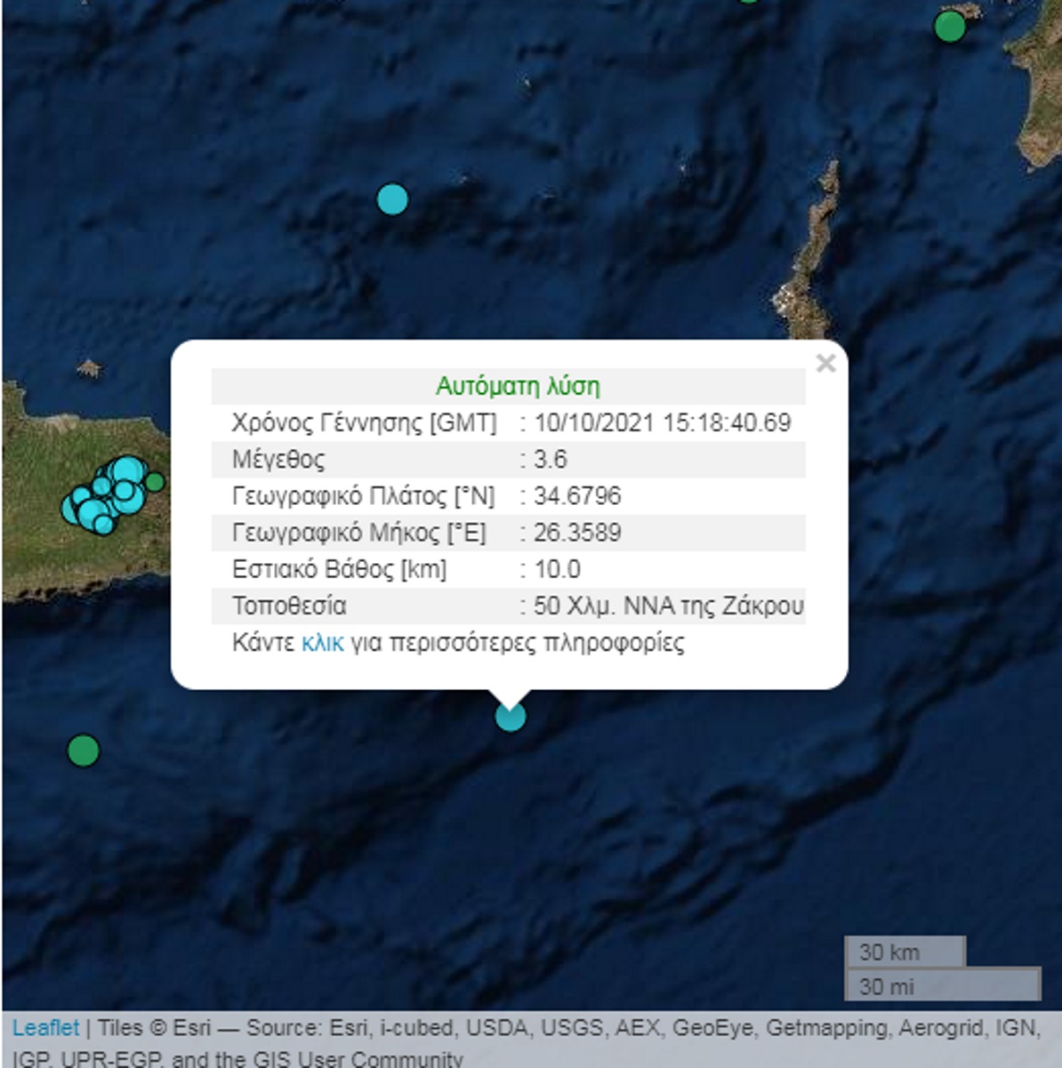 Ο σεισμός στη Ζάκρο έγινε στις 18:18′ λεπτά το απόγευμα της Κυριακής (10.10.2021) και σύμφωνα με το Γεωδυναμικό Ινστιτούτο του Εθνικού Αστεροσκοπείου Αθηνών έχει μέγεθος 3,6 βαθμούς της κλίμακας Ρίχτερ.