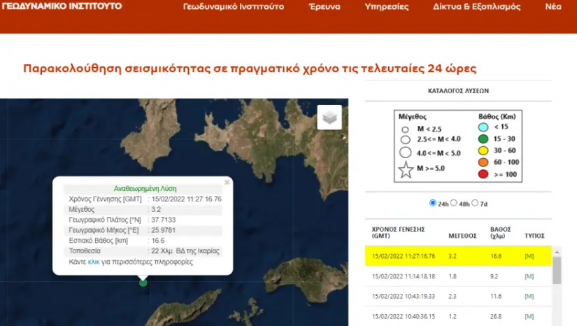 Σύμφωνα με το Γεωδυναμικό Ινστιτούτο του Εθνικού Αστεροσκοπείου Αθηνών, το μεσημέρι της Τρίτης, σημειώθηκε σεισμική δόνηση 3,2 βαθμών της κλίμακας Ρίχτερ στο θαλάσσιο χώρο, 22 χιλιόμετρα βορειοδυτικά της πόλης της Ικαρίας.