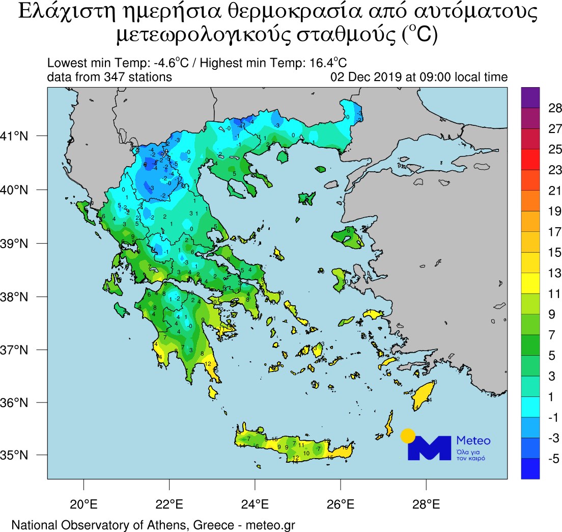 Το δίκτυο των αυτόματων μετεωρολογικών σταθμών του Εθνικού Αστεροσκοπείου Αθηνών-meteo.gr κατέγραψε τις χαμηλότερες θερμοκρασίες.