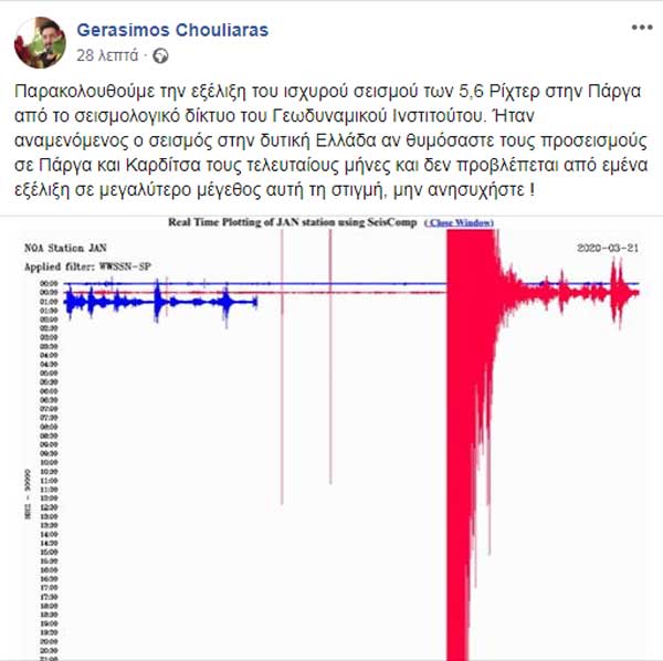 Με ανάρτησή στο facebook δήλωσε: «Παρακολουθούμε την εξέλιξη του ισχυρού σεισμού των 5,6 Ρίχτερ από το σεισμολογικό δίκτυο του Γεωδυναμικού Ινστιτούτου. Ήταν αναμενόμενος ο σεισμός στην δυτική Ελλάδα αν θυμόσαστε τους προσεισμούς σε Πάργα και Καρδίτσα τους τελευταίους μήνες και δεν προβλέπεται από εμένα εξέλιξη σε μεγαλύτερο μέγεθος αυτή τη στιγμή, μην ανησυχήστε».