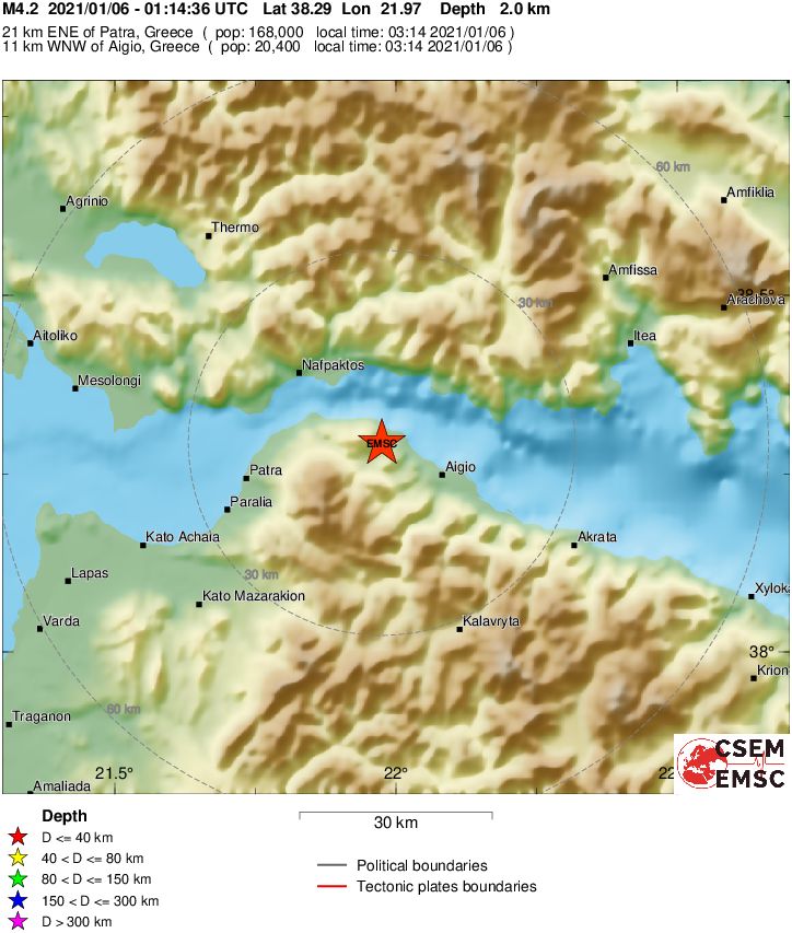Το εστιακό βάθος του σεισμού, σύμφωνα με την πρώτη εκτίμηση του EMSC, υπολογίζεται στα 2 χλμ.