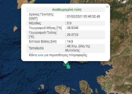 Ισχυρή σεισμική δόνηση μεγέθους 5 βαθμών της κλίμακας Ρίχτερ σημειώθηκε στις 07:46 το πρωί της Δευτέρας 1η Φεβρουαρίου στην Μυτιλήνη.