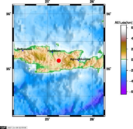 H αναθεωρημένη λύση του Γεωδυναμικού Ινστιτούτου του Αστεροσκοπείου Αθηνών δίνει το σεισμό στα 3,9 Ρίχτερ, με εστιακό βάθος τα 14,8 χλμ., και επίκεντρο τα 21 χλμ. νοτιοανατολικά του Ηρακλείου.