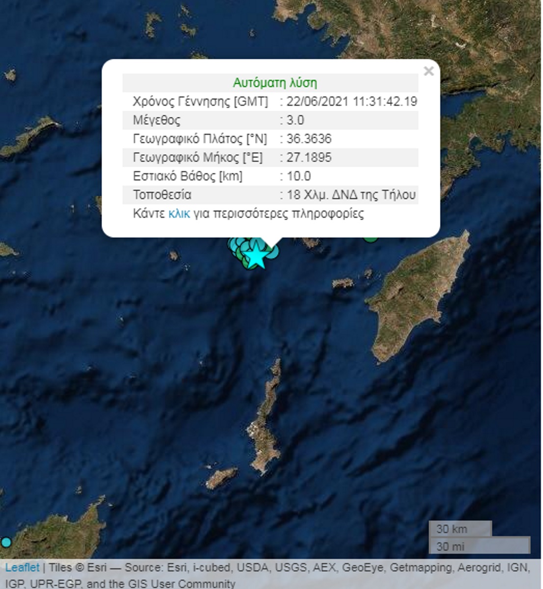 Νέα σεισμική δόνηση «ταρακούνησε» τη θαλάσσια περιοχή ανάμεσα τη Νίσυρο και την Τήλο μετά την ισχυρή των 5,7 βαθμών της κλίμακας Ρίχτερ που σημειώθηκε στις 01:14′ τα ξημερώματα της Τρίτης (22.06.2021).