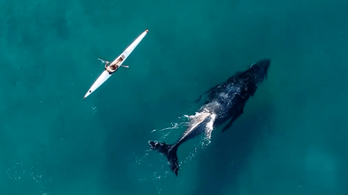 Ένα μοναδικό στιγμιότυπο κατέγραψε ένας κάτοχος drone, καθώς «έπιασε» τη στιγμή όπου μια φάλαινα ακολούθησε έναν καγιάκερ στην παραλία Bondi Beach στην Αυστραλία.