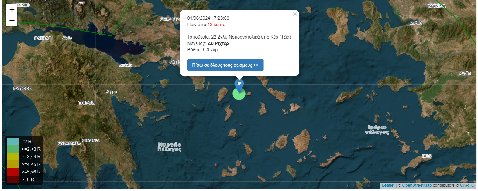 Στις 17:23 το απόγευμα του Σαββάτου (1/6), σημειώθηκε ασθενής σεισμική δόνηση 2,8 Ρίχτερ στην Τζια.