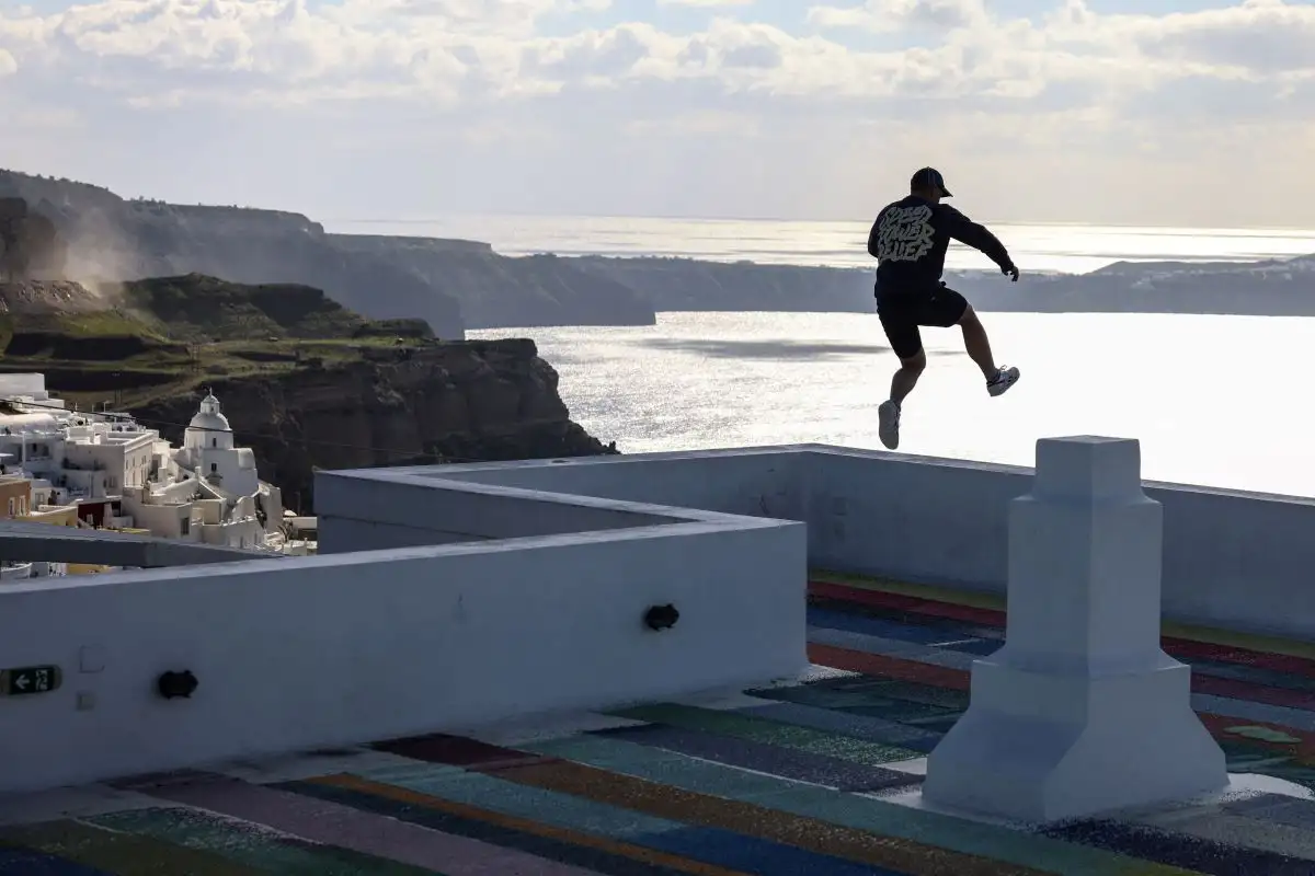 Αθλητές του parkour πηδάνε από στέγη σε στέγη εν μέσω των ατελείωτων Ρίχτερ στη Σαντορίνη (φωτο)