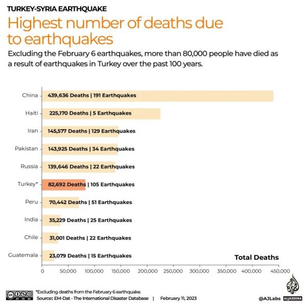Σε γράφημά του το Al Jazeera παρουσιάζει τις χώρες που έχουν τα περισσότερα θύματα από χτυπήματα του Εγκέλαδου τα τελευταία 100 χρόνια, εξαιρώντας τους σεισμούς της 6ης Φεβρουαρίου στην Τουρκία.