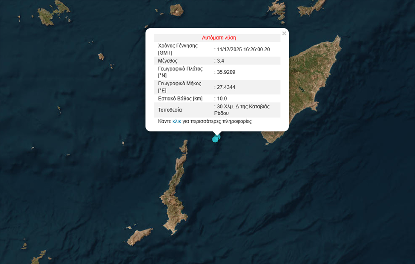 Διπλή σεισμική δόνηση σημειώθηκε το απόγευμα της Πέμπτης (11/12) στα ανοικτά της Ρόδου.