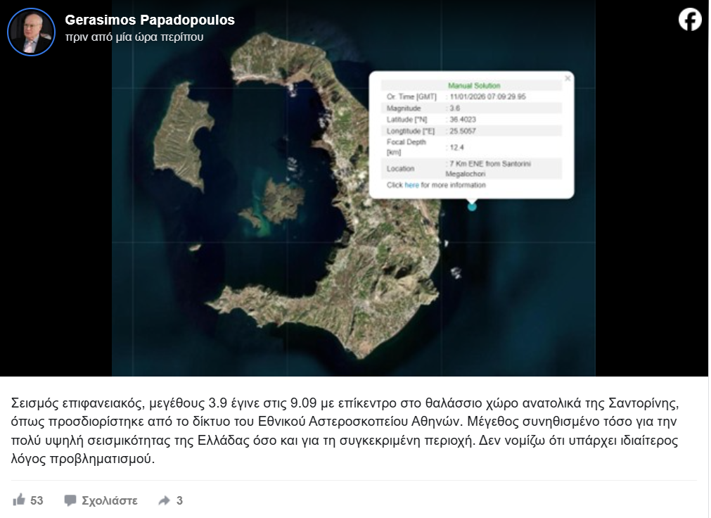 Ο Γεράσιμος Παπαδόπουλος με ανάρτησή του το πρωί της Κυριακής (11/1) στα μέσα κοινωνικής δικτύωσης, αναφέρθηκε στον σεισμό των 3,6 Ρίχτερ που σημειώθηκε στη Σαντορίνη, τονίζοντας ότι δεν «υπάρχει ιδιαίτερος λόγος προβληματισμού».