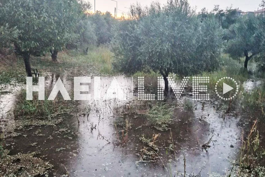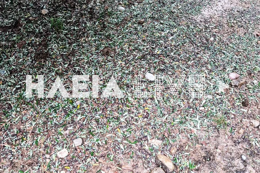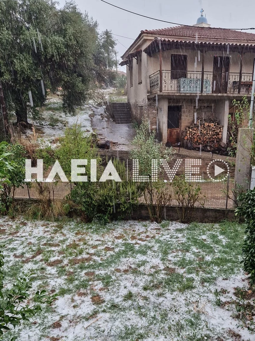 Χθες το απόγευμα η βροχόπτωση στην Ηλεία ήταν έντονη συνοδευόμενη από πολύ πυκνό χαλάζι που κάλυψε τα πάντα και ράβδισε τις ελιές.