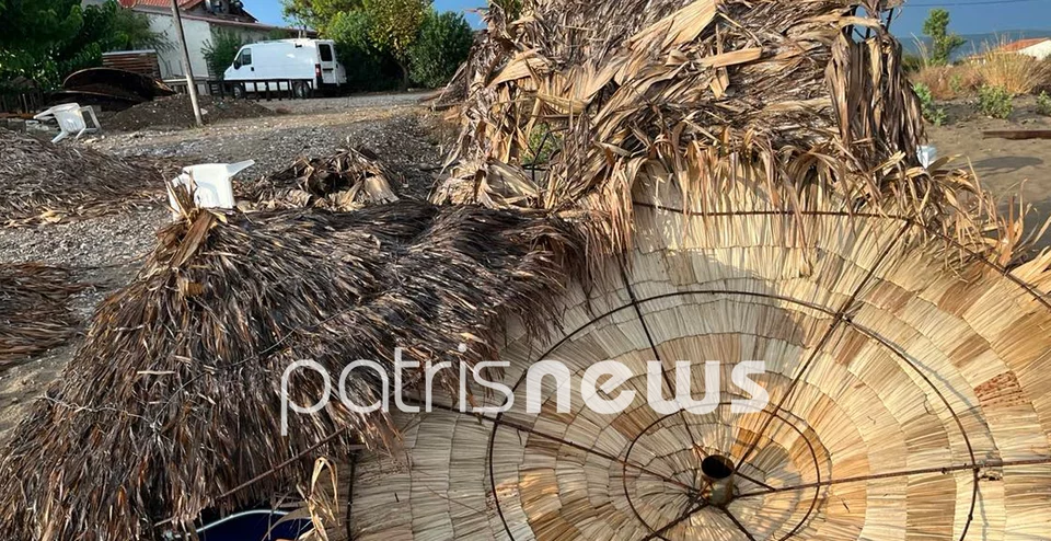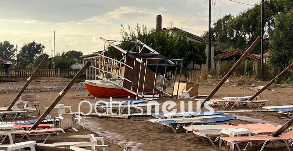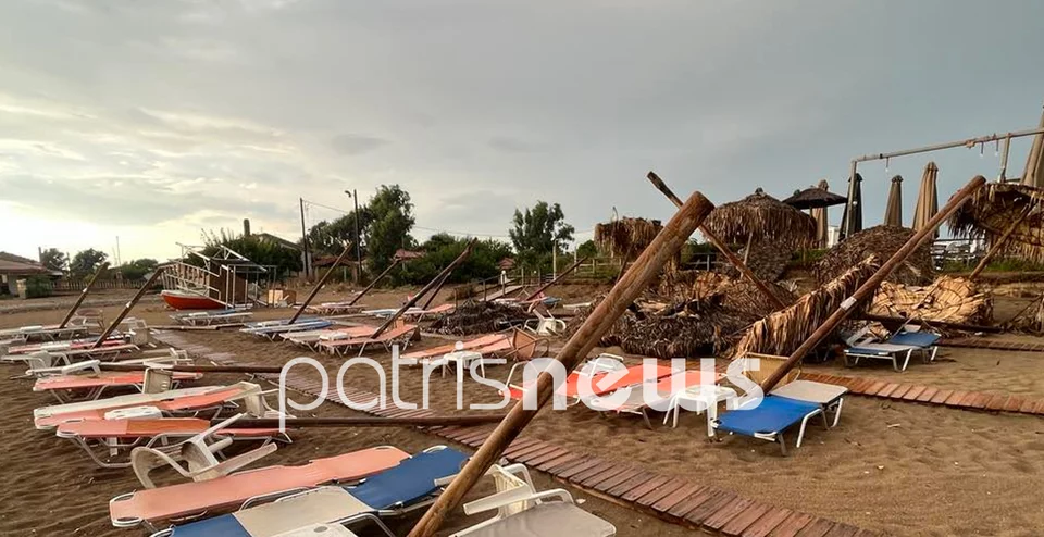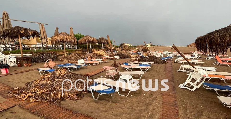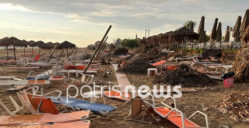 Ομπρέλες, ξαπλώστρες και ο πύργος του ναυαγοσώστη, παρασύρθηκαν από τους ισχυρούς ανέμους με την εικόνα να θυμίζει βομβαρδισμένο τοπίο.