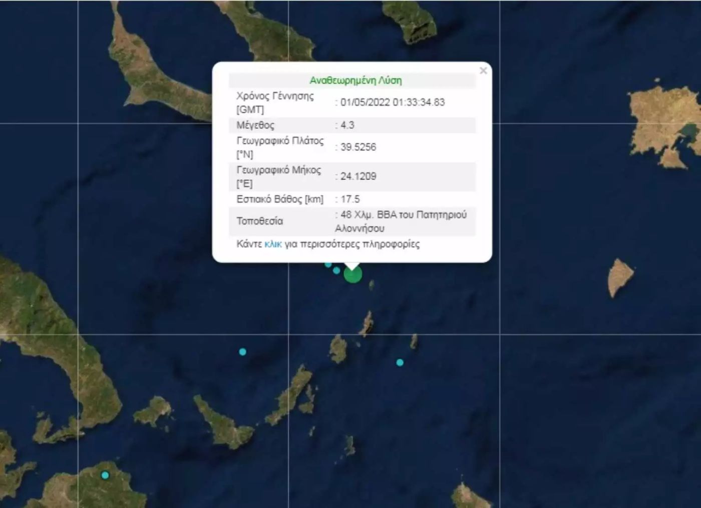Όπως ανακοίνωσε το Γεωδυναμικό Ινστιτούτο του Εθνικού Αστεροσκοπείου Αθηνών, στις 04:33 τα ξημερώματα της Κυριακής 1η Μαΐου, σημειώθηκε σεισμός μεγέθους 4,3 βαθμών της κλίμακας Ρίχτερ στα ανοικτά της Αλοννήσου.