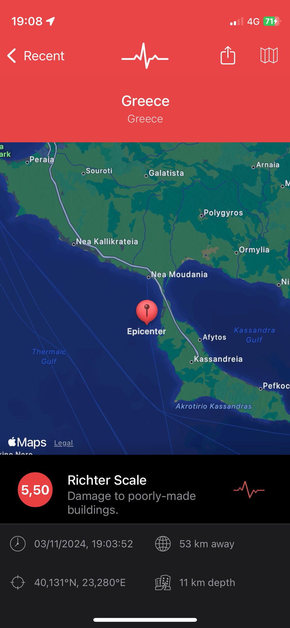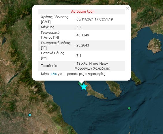 Ισχυρή σεισμική δόνηση 5,2 Ρίχτερ σημειώθηκε το απόγευμα της Κυριακής (3/11) στη Χαλκιδική.