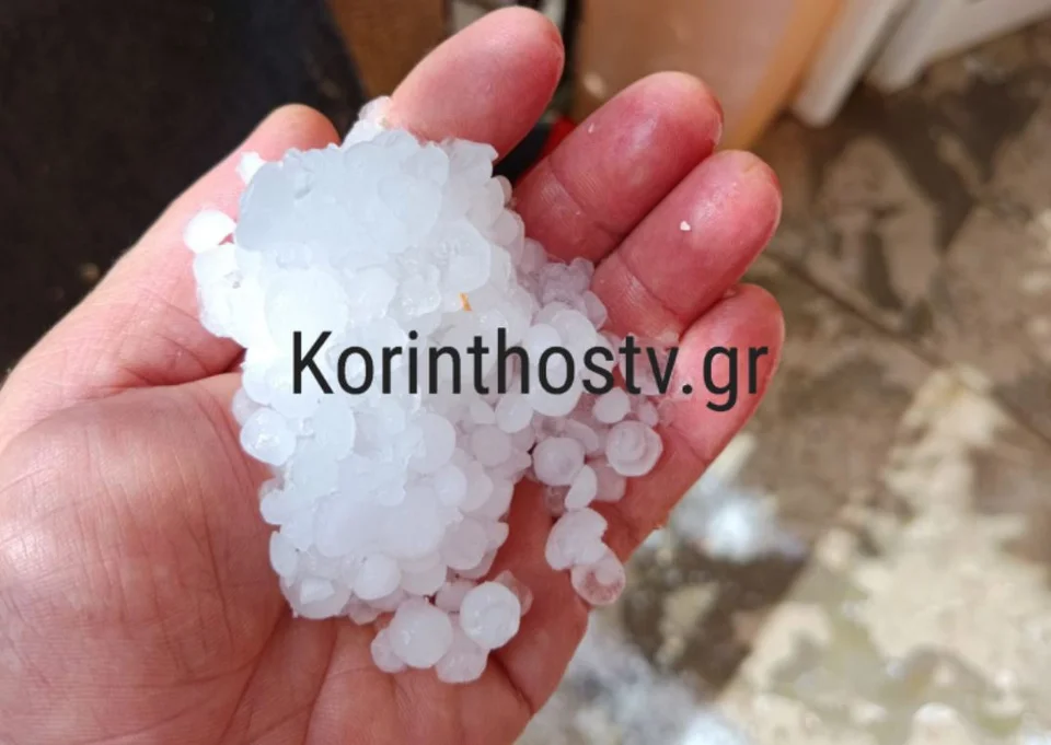 Παράλληλα η χαλαζόπτωση έπληξε και τα Αθίκια Κορινθίας, το μεσημέρι της Τετάρτης.
