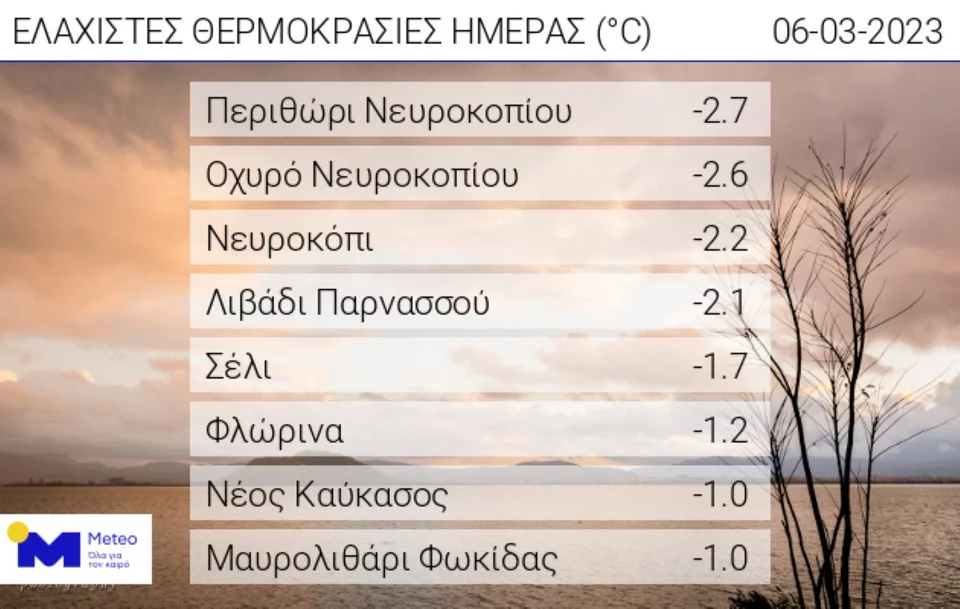 H χαμηλότερη ελάχιστη θερμοκρασία καταγράφηκε στο Περιθώρι Νευροκοπίου με -2.7°C. Σύμφωνα με το δίκτυο αυτόματων μετεωρολογικών σταθμών του Εθνικού Αστεροσκοπείου Αθηνών / meteo.gr οι οκτώ χαμηλότερες ελάχιστες θερμοκρασίες της ημέρας, παρουσιάζονται στον παρακάτω πίνακα: