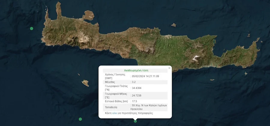 Το απόγευμα της Δευτέρας (5/2), σημειώθηκε σεισμική δόνηση μεγέθους 3,2 βαθμών της κλίμακας Ρίχτερ κοντά στα Μάταλα, νότια της Κρήτης.