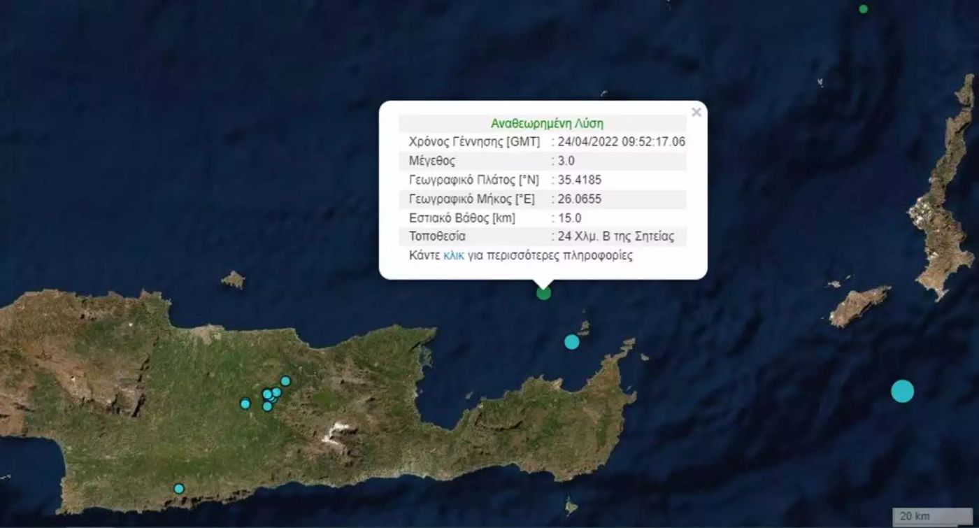 Σύμφωνα με το Γεωδυναμικό Ινστιτούτο του Εθνικού Αστεροσκοπείου Αθηνών, στις 11:52 το πρωί της Κυριακής του Πάσχα, σημειώθηκε σεισμός μεγέθους 3 βαθμών της κλίμακας Ρίχτερ στη Σητεία.