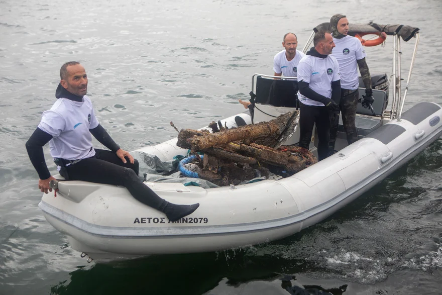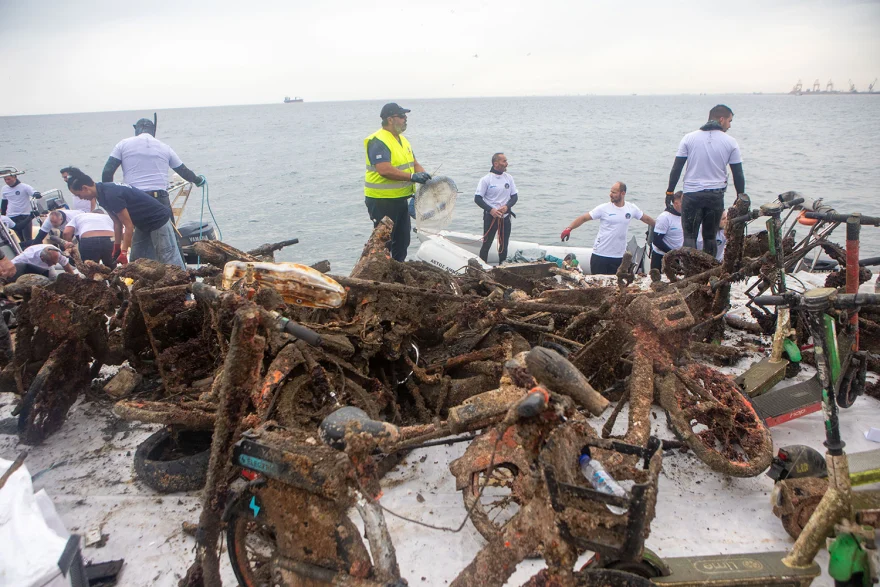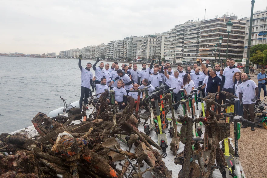 Δύτες που βούτηξαν στον Θερμαϊκό Κόλπο, στο ύψους του Λευκού Πύργου, στη Θεσσαλονίκη το πρωί της Τρίτης «ψάρεψαν» ηλεκτρικά πατίνια, ποδήλατα, ελαστικά οχημάτων, κούπες, πλαστικά μπουκάλια, σκαμπό, ακόμη και βάση ομπρέλας.