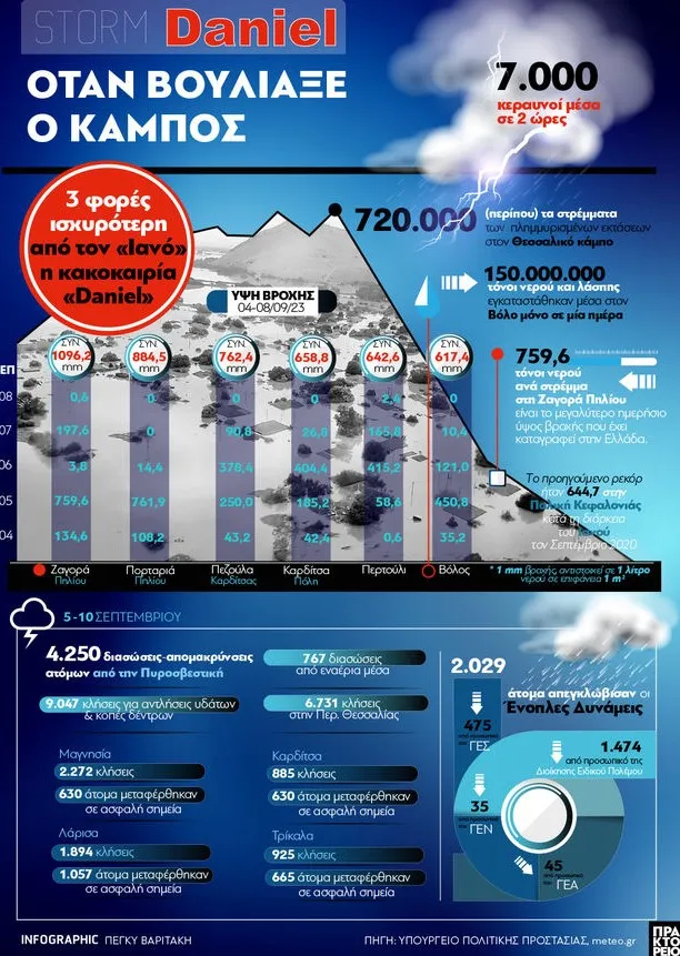 Το Εθνικό Αστεροσκοπείο Αθηνών / Meteo.gr, παρουσίασε ένα γράφημα στο οποίο αποτυπώνεται το μέγεθος της καταστροφής στον θεσσαλικό κάμπο από την κακοκαιρία Daniel.
