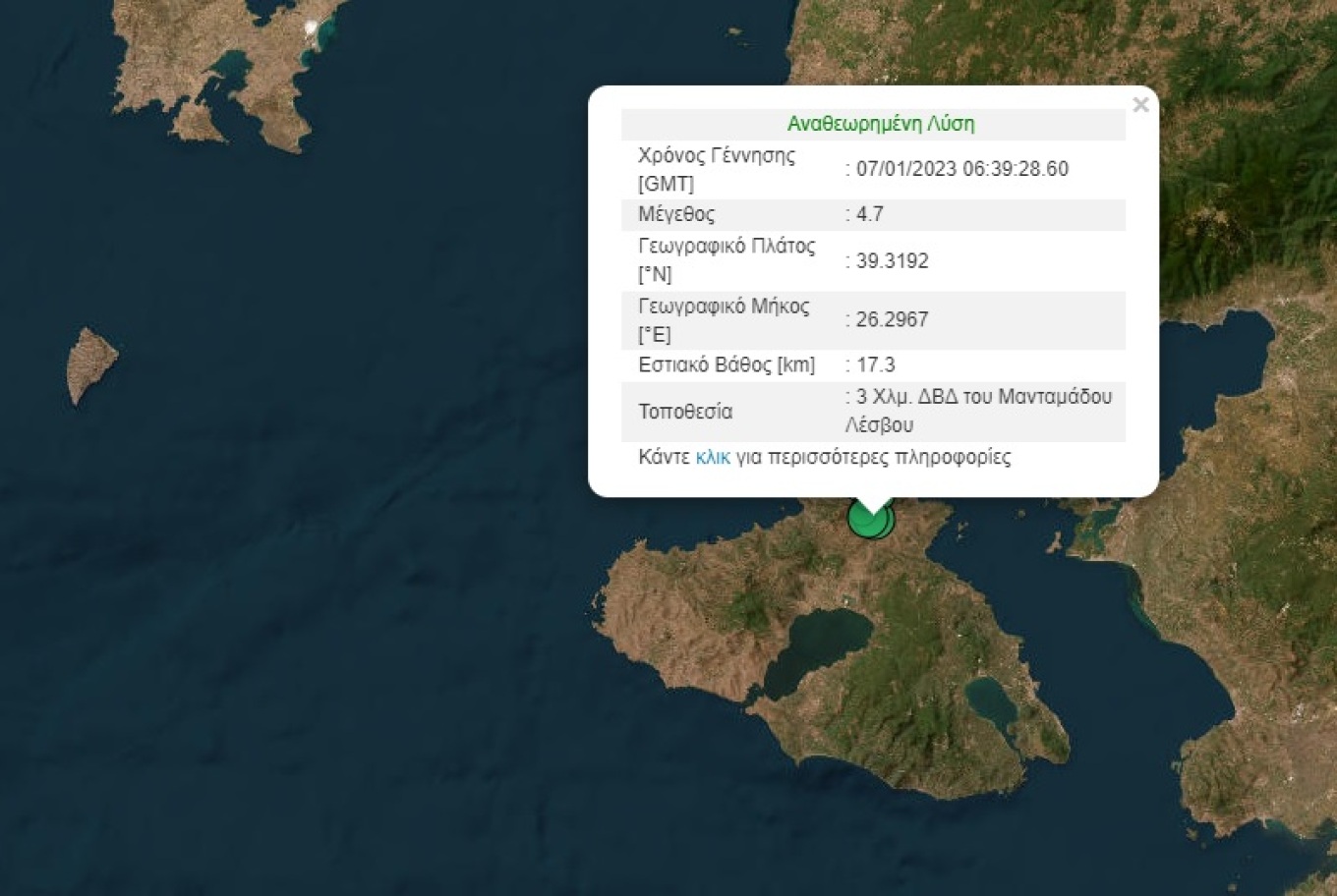 Συγκεκιρμένα, σύμφωνα με την καταγραφή του Γεωδυναμικού, το νησί «κουνήθηκε» από 4,7 Ρίχτερ, που είχαν επίκεντρο στα 3 χιλιόμετρα δυτικά-βορειοδυτικά του Μανταμάδου, ενώ το εστιακό βάθος ήταν στα 17,3 χλιόμετρα.