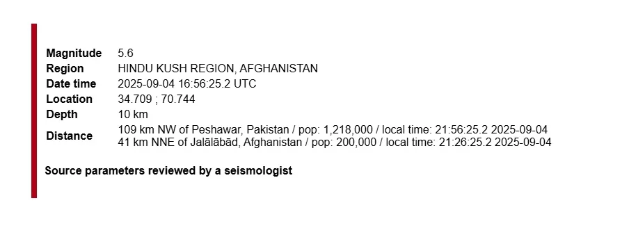 Νέα ισχυρή σεισμική δόνηση 5,6 βαθμών της κλίμακας Ρίχτερ σημειώθηκε στο Αφγανιστάν, σύμφωνα με το Ευρωμεσογειακό Ινστιτούτο.