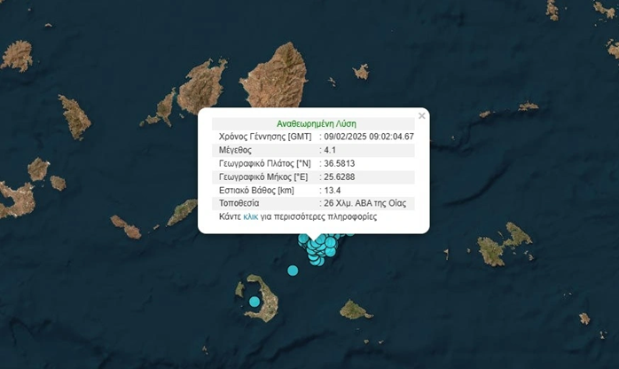 Το πρωί της Κυριακής (9/2) σημειώθηκε νέα ισχυρή σεισμική δόνηση μεγέθους 4,1 βαθμών της κλίμακας Ρίχτερ στη Σαντορίνη.
