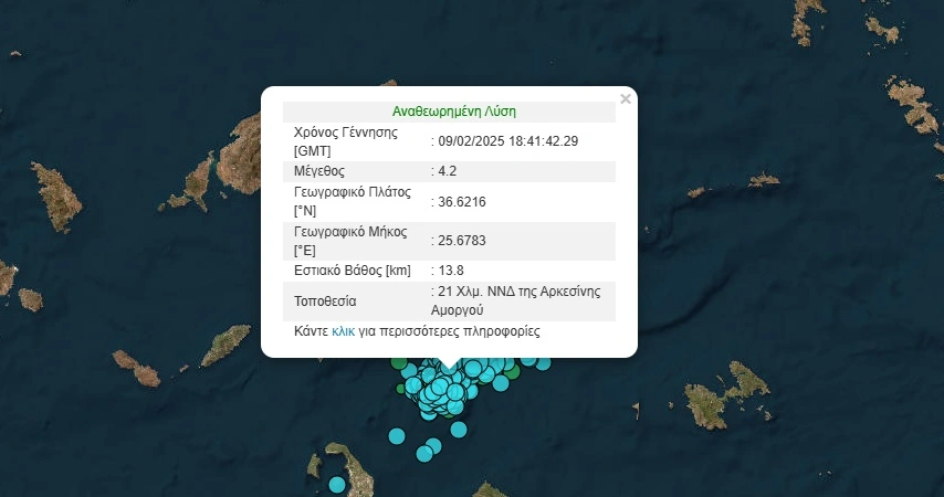 (Ανανέωση): Πριν λίγο δύο σεισμικές δονήσεις 4,3 Ρίχτερ σημειώθηκαν ανοιχτά της Αμοργού και της Ανάφης αντίστοιχα.Σύμφωνα με το Γεωδυναμικό Ινστιτούτο μέσα σε ένα τέταρτο έχουν σημειωθεί τέσσερις σεισμικές δονήσεις άνω των 4,1 Ρίχτερ.