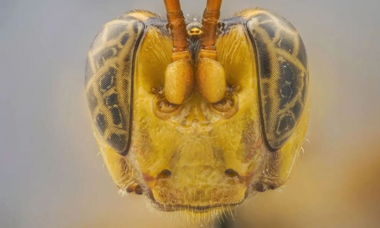 Η φωτεινή κίτρινη σφήκα έχει ένα μεγάλο κεφάλι, μια μεγάλη γνάθο και ελαφρώς άνισα δόντια.