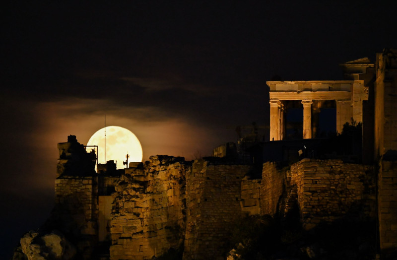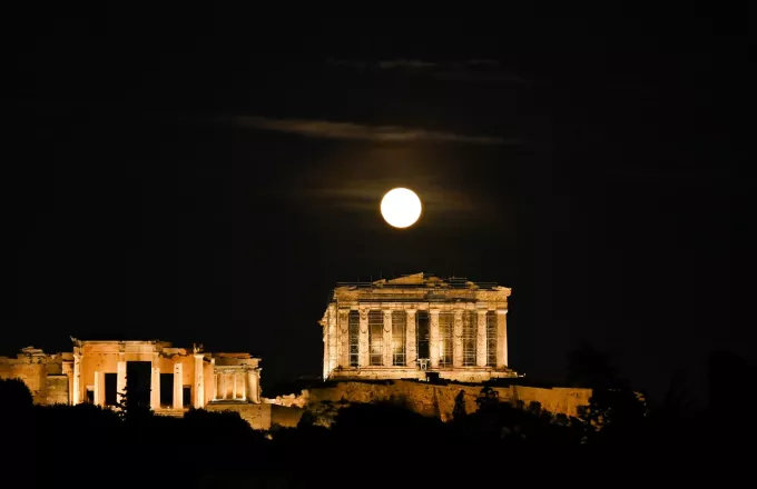 Εντυπωσιακές είναι οι εικόνες από την πανσέληνο του χιονιού, πάνω από τον ιερό βράχο της Ακρόπολης.