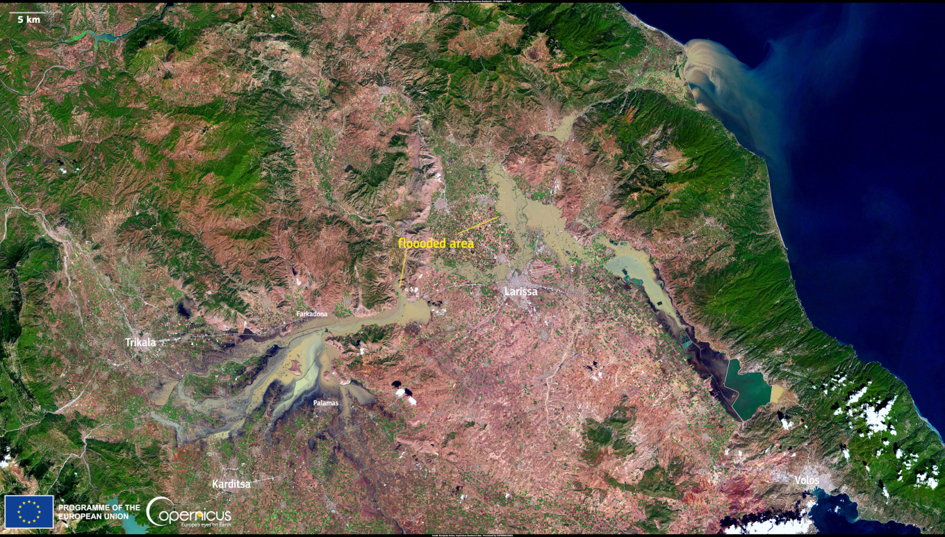 Στη φωτογραφία που δημοσιεύθηκε στον λογαριασμό της υπηρεσίας Copernicus στο Χ (πρώην twitter) έχει αποτυπωθεί η περιοχή γύρω από τη Λάρισα «που συνεχίζουν να επηρεάζονται σφόδρα από τις πλημμύριες του ποταμού Πηνειού».