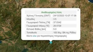 Σεισμική δόνηση 3,5 Ρίχτερ σημειώθηκε το μεσημέρι της Κυριακής (24/12) στη Ρόδο.