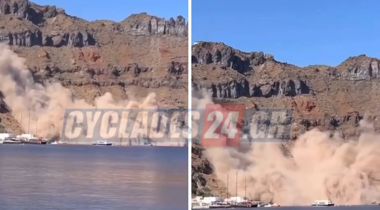 Ένα βίντρο ντοκουμέντο που καταγράφηκε από επιβάτες σκάφους, δείχνει τη στιγμή της κατολίσθησης βράχων στη Θηρασιά της Σαντορίνης.