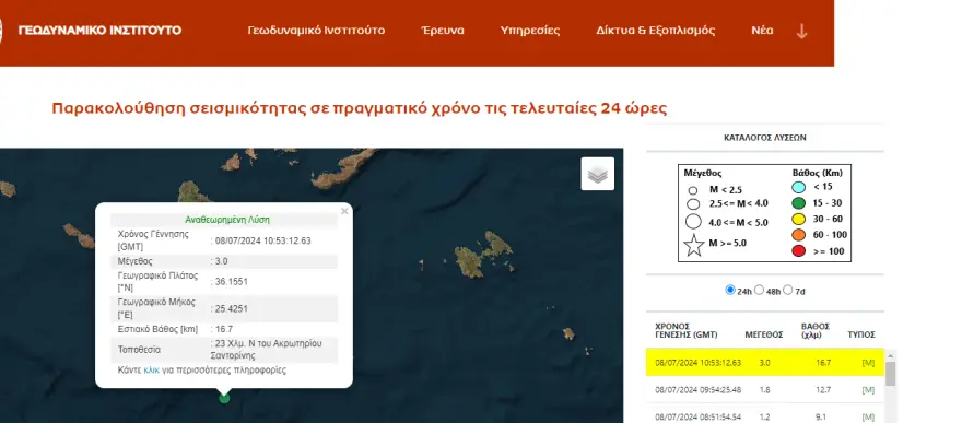 Η δόνηση καταγράφεται 23 χιλιόμετρα νότια του Ακρωτηρίου Σαντορίνης.