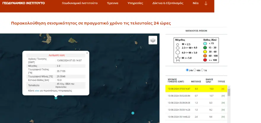 Σεισμική δόνηση 3 Ρίχτερ στα ανοιχτά της Κρήτης (φώτο)