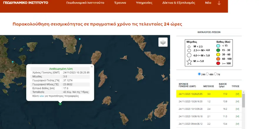 Ο σεισμός σημειώθηκε σε απόσταση 43 χιλιομέτρων νοτιοανατολικά της Ύδρας και σε εστιακό βάθος 17 χιλιομέτρων