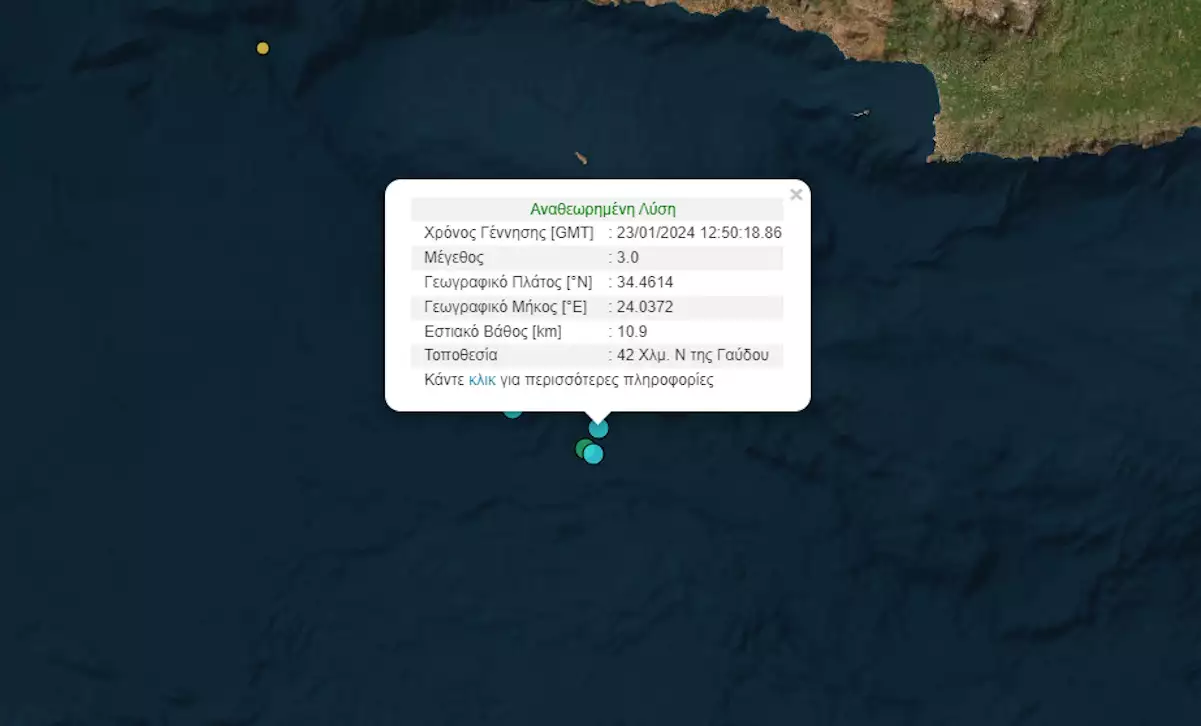 Σεισμική δόνηση μεγέθους 3 βαθμών της κλίμακας Ρίχτερ σημειώθηκε ανοιχτά της Γαύδου, σύμφωνα με το Γεωδυναμικό Ινστιτούτο του Εθνικού Αστεροσκοπείου Αθηνών.