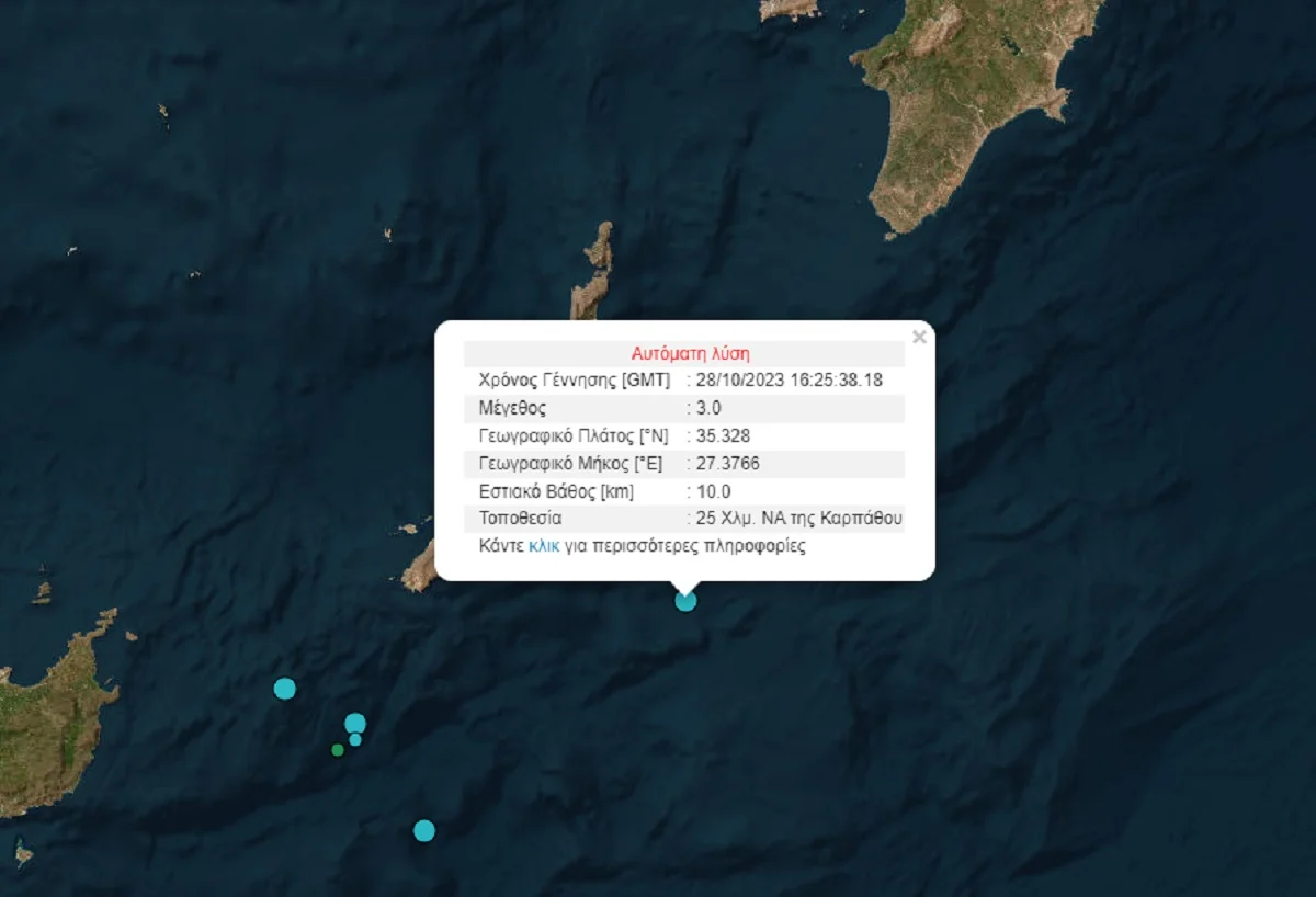 Το απόγευμα του Σαββάτου (28/10), σημειώθηκε σεισμική δόνηση μεγέθους 3 βαθμών της κλίμακας Ρίχτερ, στην Κάρπαθο.