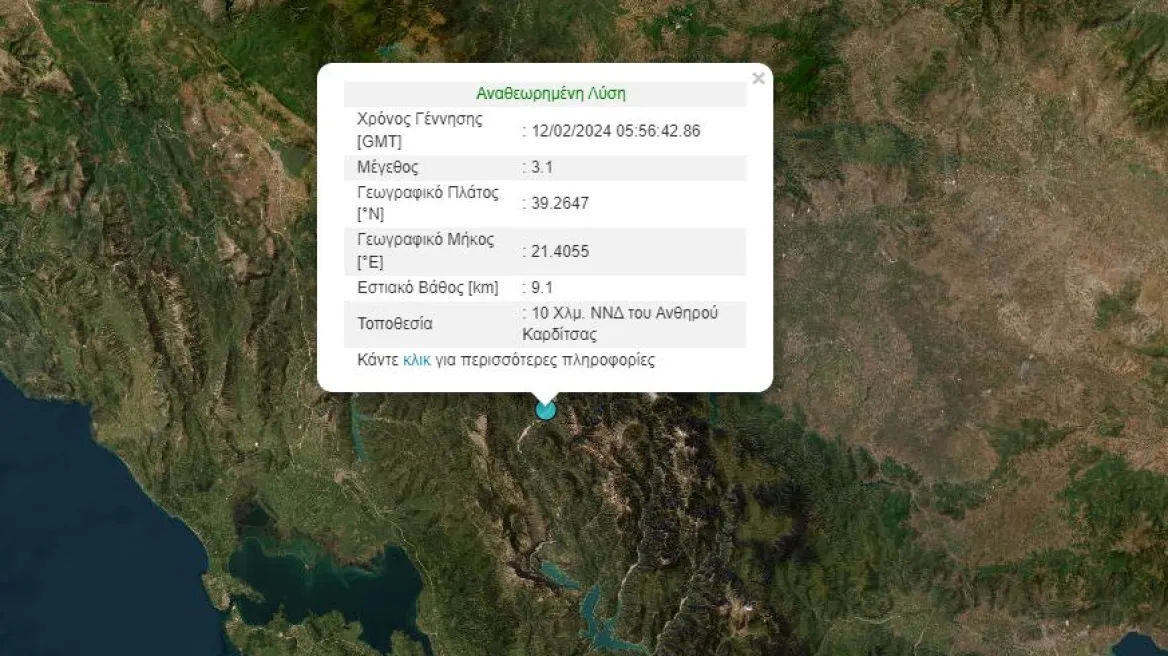 Σύμφωνα με το Γεωδυναμικό Ινστιτούτο ο σεισμός των 3,1 Ρίχτερ σημειώθηκε στις 7:56 το πρωί με επίκεντρο 10 χλμ. νοτιοδυτικά του Ανθηρού Καρδίτσας.