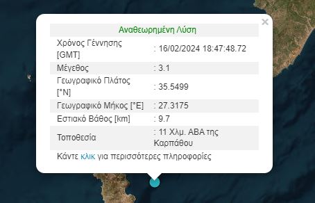 Σεισμική δόνηση 3,1 Ρίχτερ καταγράφηκε σήμερα (16/2) το απόγευμα στην Κάρπαθο.