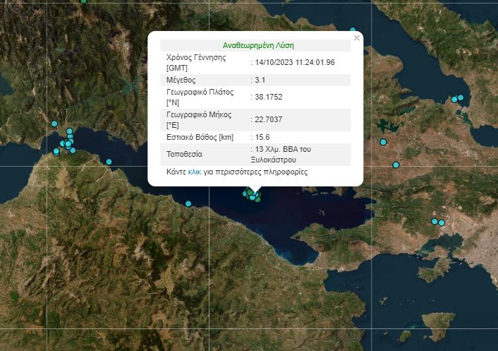 Σεισμική δόνηση 3,1 βαθμών της κλίμακας Ρίχτερ σημειώθηκε, σήμερα (14/10) στον Κορινθιακό Κόλπο.