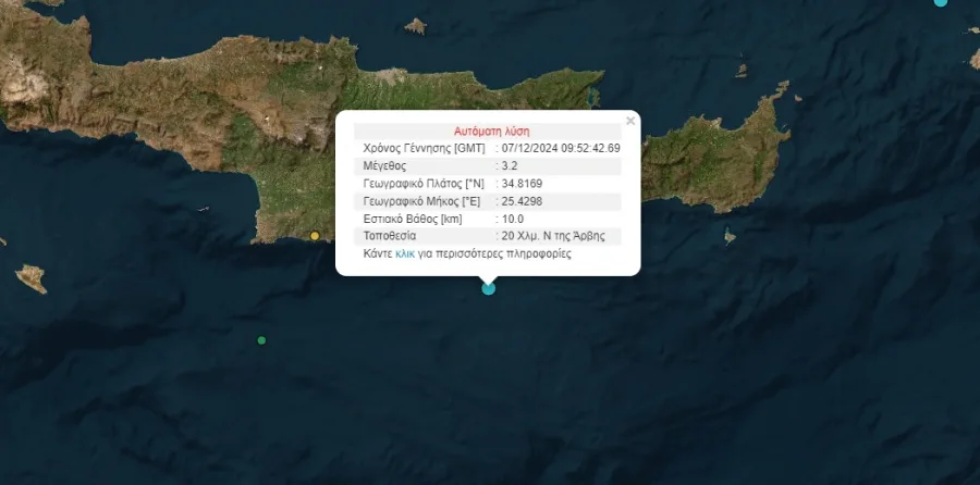 Σεισμός μεγέθους 3,2 της κλίμακας Ρίχτερ σημειώθηκε πριν από λίγο ανοιχτά της Κρήτης.