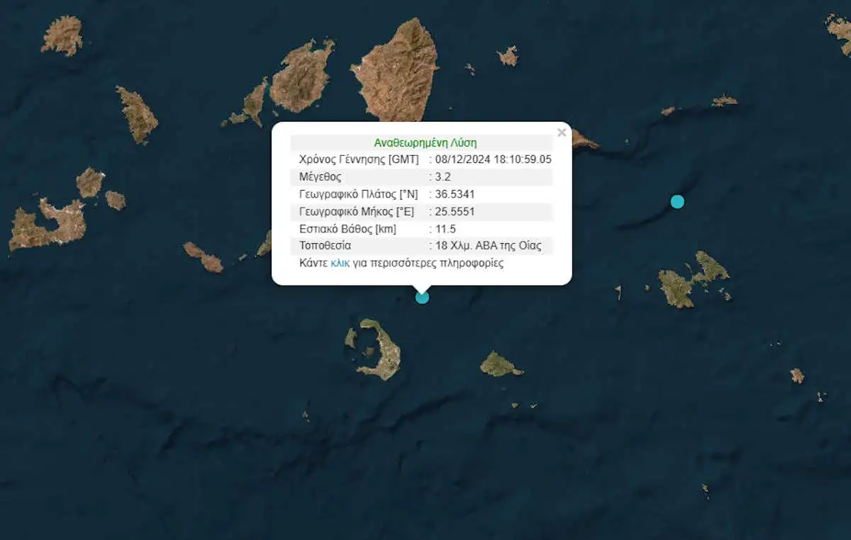 Σεισμική δόνηση 3,2 βαθμών της κλίμακας Ρίχτερ σημειώθηκε στις 8:10 το βράδυ της Κυριακής (08.12.2024) ανοιχτά της Σαντορίνης.