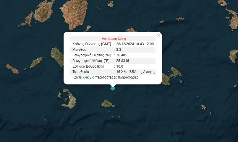 Ο σεισμός συνέβη 16 χλμ ΒΒΑ της Ανάφης και είχε εστιακό βάθος 10 χλμ